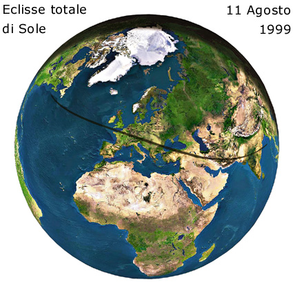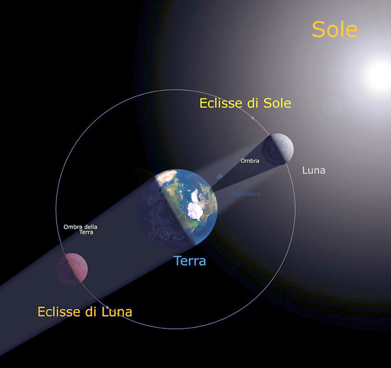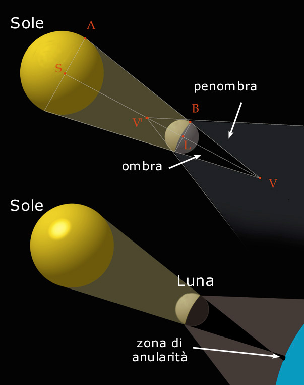 Quando la Luna, muovendosi attorno alla Terra, passa davanti al Sole, viene illuminata e lascia dietro di sé un cono d'ombra ed un cono, molto più ampio, di penombra. Chiunque si trovi all'interno dell'ombra o della penombra vedrà il Sole totalmente o parzialmente oscurato da un'eclisse totale o parziale, rispettivamente. Dato che i tre corpi interessati si muovono ognuno rispetto agli altri, l'ombra e la penombra percorrono sulla Terra traiettorie lunghe anche molte migliaia di chilometri e di larghezza 270 km, al massimo, l'ombra e circa 7000 km la penombra.