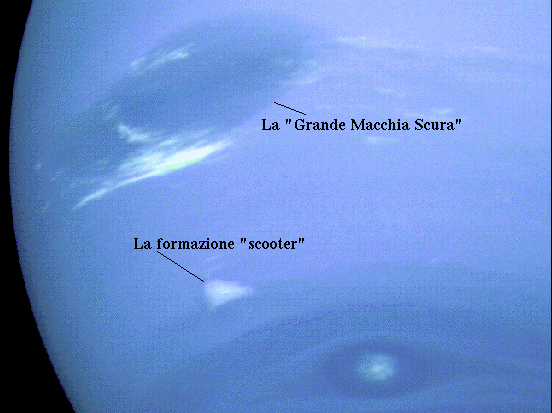 Immagini in luce verde e rossa mostrano dettagli più profondi fra cui una formazione nuvolosa detta Scooter (nell'immagine è sotto la "Grande Macchia Scura"). Lo Scooter è una macchia bianca irregolare il cui nome deriva dal fatto che si muove attorno alla superficie più rapidamente delle formazioni nuvolose che la circondano impiegando circa 16 ore a percorrere tutto il pianeta. Dal momento che questa formazione, insieme ad altre analoghe, impiega lo stesso periodo delle regioni interne del pianeta, si pensa che abbia avuto origine da una macchia calda e profonda e che si osservi in realtà una colonna ascendente di solfuro di idrogeno situato nello strato sottostante quello delle nubi di metano.