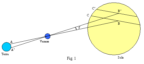 Un osservatore posto in A (fig. 1) vedrà il pianeta descrivere la corda C, mentre un osservatore posto in A’ lo vedrà transitare sulla corda C’, cosicché, ad uno stesso istante, Venere apparirà in due punti diversi, rispettivamente B e B’. La separazione angolare tra B e B’ (angolo f) può essere ottenuta dalla differenza della durata del transito nei due luoghi di osservazione; d’altra parte la distanza tra i due punti A e A’ è nota, così che è possibile risalire alla distanza BB’ ed infine alla distanza Terra-Sole cercata.
