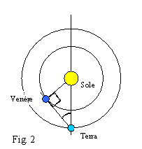 Cerchiamo ora di eseguire i calcoli utilizzando un metodo semplificato. L’elongazione massima di Venere - la sua distanza apparente dal Sole, vista dalla Terra - varia da 45° a 48°: per comodità, ipotizziamo orbite circolari e prendiamo il valore medio di elongazione massima di Venere, pari a 46° (fig. 2):
