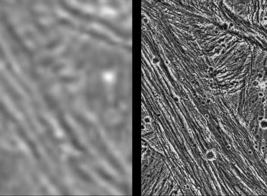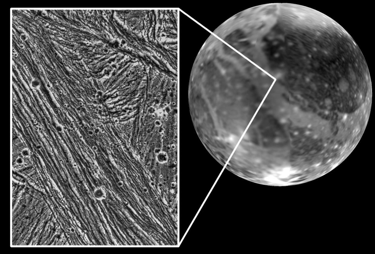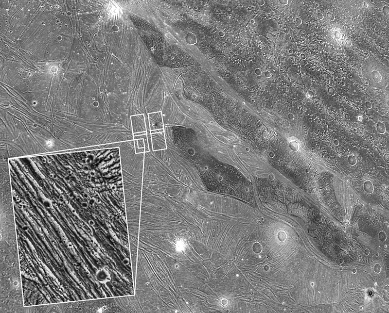 Immagine dettagliata della superficie di Ganimede presa dalla sonda Galileo